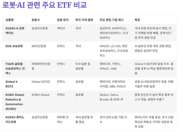 국내 시장 중심 ETF 가운데서는 삼성자산운용의 KODEX 로봇액티브가 단기 모멘텀의 영향을 비교적 빠르게 반영하는 특징이 있는 것으로 보인다. 반도체 대형주와 로봇 제조기업을 함께 담아 성장성이 높은 종목군에 비중을 두는 전략을 사용하며 국내 테마 노출도가 높아 성과가 뚜렷하게 나타나는 시기가 있다. KB자산운용의 RISE AI&로봇은 NAVER와 LG CNS 같은 AI·솔루션 기업과 레인보우로보틱스·두산로보틱스 등을 분산 편입해 상대적으로 안정적인 흐름을 지향하는 국내 테마형 상품이다.