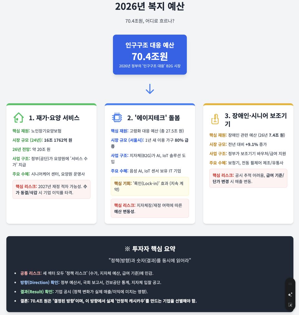 특히 저출생·고령화 대응 예산만 62.6조원에서 70.4조원으로 7.8조원 늘렸다. ‘인구구조’ 하나에 70조원 넘는 세금이 묶이는 셈이다. 주식시장에서 시선은 이 나랏돈이 어디로 흘러가는지에 쏠린다. 2026년 예산안은 현금성 지원을 유지하면서도 ‘서비스·기술·보조기기’를 민간에 위탁하는 구조를 넓혔다.
