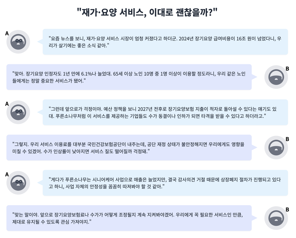 재무 구조만 놓고 보면 가장 정형화된 B2G 모델이다. 코스닥 상장사 푸른소나무(057880)는 이 구조를 활용하는 대표적인 시니어케어 종목이다. 회사는 수도권 중심으로 9개 주·야간보호센터와 요양원을 운영하고, 치매안심센터 2개소를 위탁받아 시니어 케어·헬스케어 사업을 펼치고 있다. 2025년 상반기 연결 기준 매출액은 전년 동기 대비 179.9% 증가했다. 증권가에서는 치매안심센터 등 공공 위탁 시설 확대와 장기요양 관련 매출이 늘어난 결과로 해석한다.