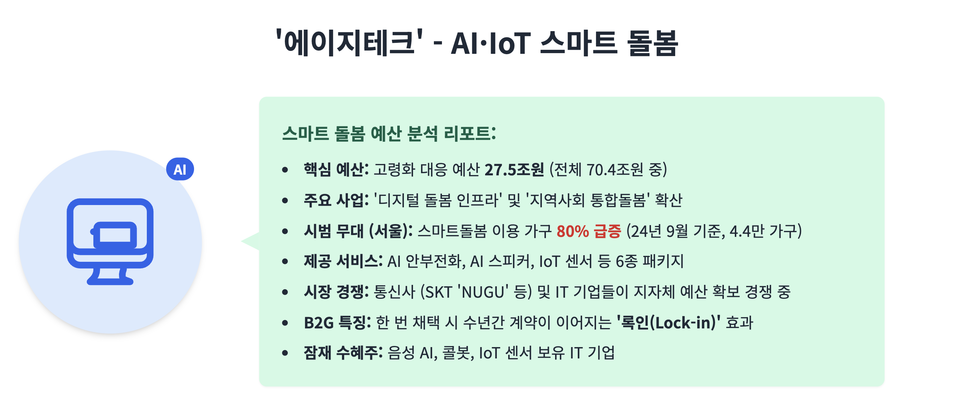 서울시 AI 안부확인서비스 사업에서 2022~2023년 SK텔레콤 ‘누구 비즈콜’이 25개 자치구 중 76%와 계약을 맺었던 사례가 대표적이다. 국내 상장사 가운데서는 음성 AI·콜봇·IoT 센서를 보유한 IT 기업들이 이 시장의 잠재 수혜주로 꼽힌다.
