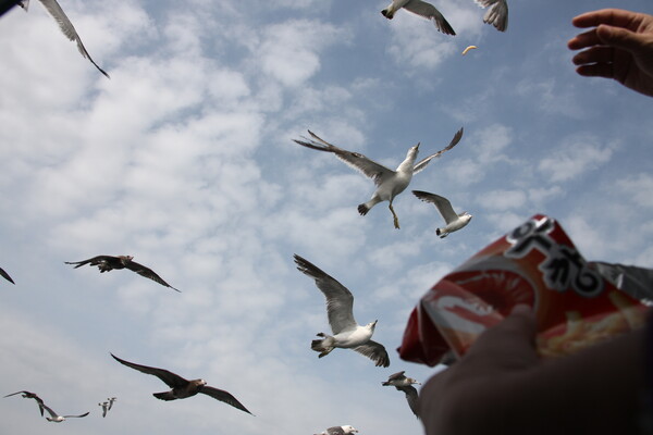 여기 갈매기는 새우깡에 익숙하지 않다. 몇 번을 던져줘도 잘 받아먹지 않는다. 사람들이 새우깡을 자주 던져주지 않아서 그렇다. 그래도 한 시간에 걸쳐 마냥 던져주니 어느 놈이 받아먹기 시작한다. 그러더니 차츰 여러 마리가 받아먹으면서 줄을 이어서 받아먹는다. 학습효과이다. 뭐든 훈련하면 된다.