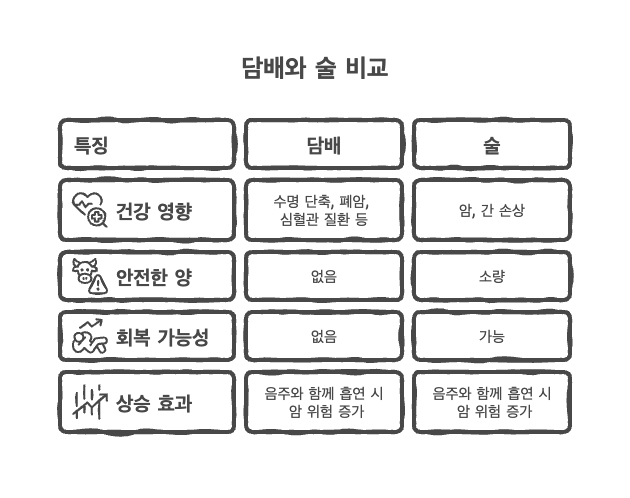 술에는 ‘적정 음주량’이라는 개념이라도 존재하지만, 담배에는 ‘안전한 흡연량’ 자체가 없다. 하루 한 개비를 피우나 한 갑을 피우나 혈관 내피세포가 손상되고 발암 물질이 DNA를 공격하는 메커니즘은 연기가 몸에 들어오는 즉시 작동하기 때문이다.