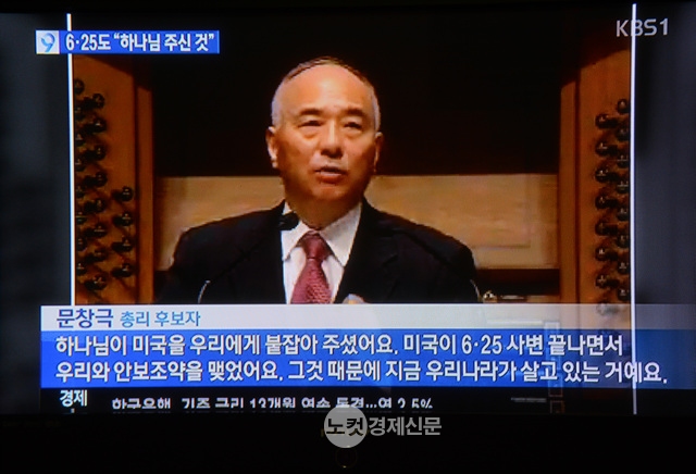 "하나님이 미국을 우리에게 붙잡아 주셨어요. 미국이 6.25 사변 끝나면서 우리와 안보조약을 맺었어요. 그것 때문에 우리가 살고 있는 거예요. 사실은 6.25를 왜 주셨냐, 미국을 붙잡기 위해서, 돌아보면, 미국을 붙잡기 위해서 주셨어요." (문 후보자 육성 내용)