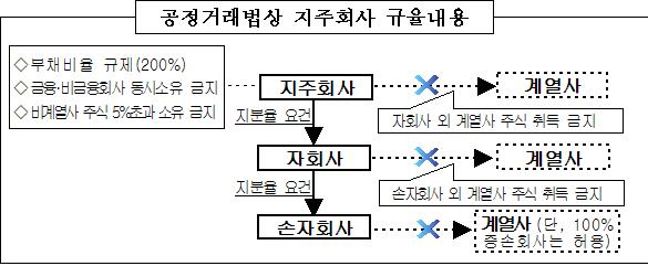 현행법상 지주회사의 손자회사는 지분 100%를 보유한 증손회사 외의 계열사 주식을 소유할 수 없다.