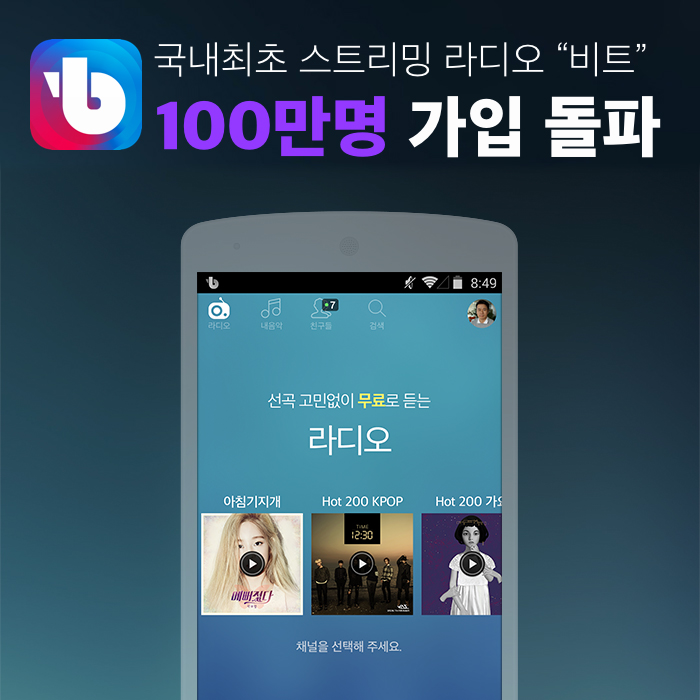 비트패킹컴퍼니(대표 박수만)는 국내 최초 스트리밍 라디오 서비스 '비트'가 이용자 100만명을 돌파했다고 27일 밝혔다. 이는 출시 7개월만으로 매달 평균 이용률이 300% 이상 증가한 수치다.