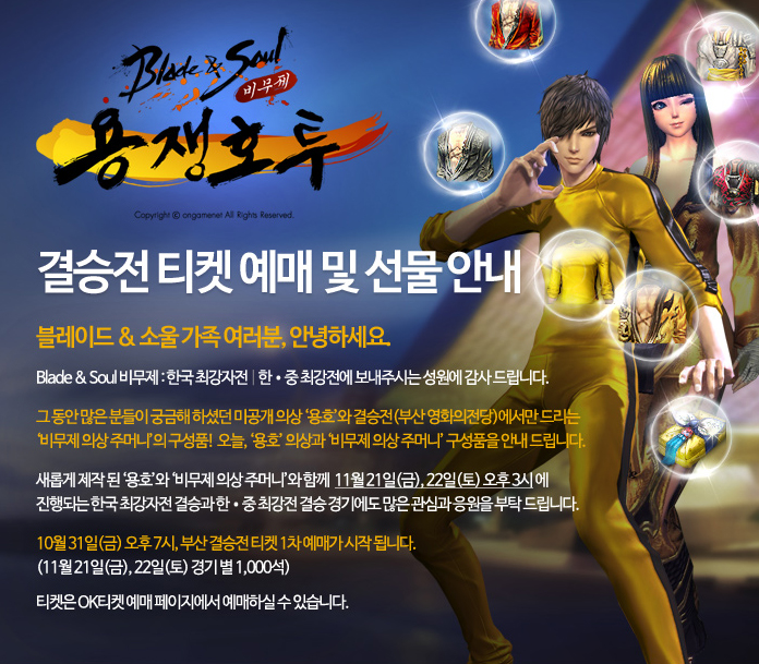 한편 현장 관람객은 특별한 선물을 받을 수 있다. '한ㆍ중 최강전' 8강과 4강 및 결승전 현장 관람객은 신규 의상 '용호'를 받을 수 있고, 부산에서 두 차례 열리는 결승전 현장 관람객은 '비무제 의상 주머니'를 받을 수 있다.