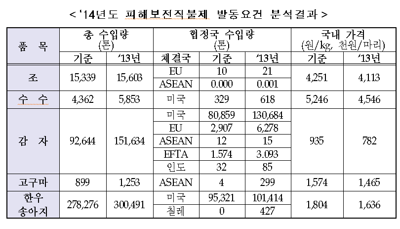 피해보전직접직불금의 경우, 지원센터의 2013년도 수입물량과 국내 가격에 대한 조사·분석 결과, 조·수수·감자·고구마·한우송아지가 발동요건을 충족한 것으로 나타났다.