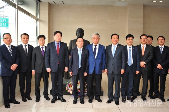 본사에 도착한 최 회장은 가장 먼저 최종건 SK그룹 창업주의 동상에 큰 절을 하고 묵념했다.