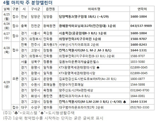 24일 부동산114와 부동산써브 등에 이달 마지막주에는 전국 15곳에서 청약접수를 진행하고 11곳에서견본주택을 여는 등 전국적으로 7212가구가 공급된다. 11곳이 문을 연다.