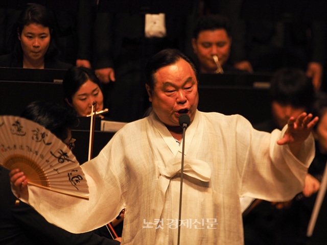 ▲ 밀양아리랑을 열창하는 테너 임웅균테너 임웅균이 30일 저녁 청주 예술의 전당에서 열린 '충북남성합창단 창단 연주회'에서 흰 한복 두루마기를 입고 우리민요 <밀양아리랑>을 열창하고 있다.