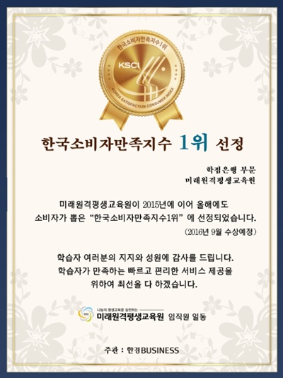 미래원격평생교육원 문규식 원장은 "작년에 이어 올해도 소비자만족지수1위에 선정되어 학습자 모두에게 감사 드린다"며 "앞으로도 양질의 교육 콘텐츠, 최적의 학사 서비스를 제공하는 기관이 될 수 있도록 노력하겠다"고 전했다.