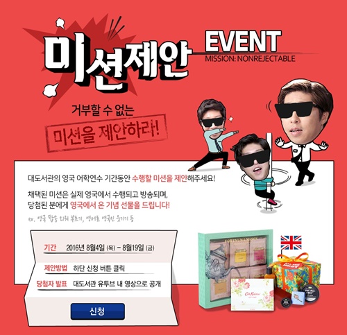 이번 체험 프로모션을 기념해 오는 8월 19일(금)까지 edm유학센터 홈페이지에서 영어정복 미션 제안 이벤트도 진행한다. 영국 팝송 외워 부르기, 영어로 외국인 웃기기 등 대도서관의 영국 어학연수 기간 동안 실제로 해주길 원하는 다양하고 참신한 미션을 제안하면 대도서관이 미션을 방송에서 수행하는 것은 물론 미션이 채택된 주인공에게는 영국에서 대도서관이 직접 고른 특별한 선물을 제공한다.