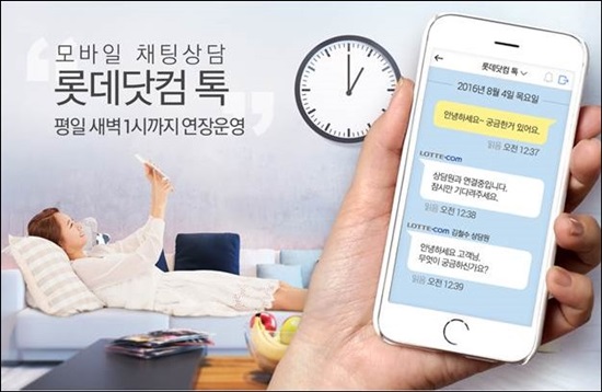롯데닷컴 모바일 앱에서 상품∙주문∙배송∙반품 등 구매과정 중의 전 문의 사항을 즉각적으로 상담 받을 수 있다. 본 서비스는 고객이 채팅 창에 사진을 첨부하거나 상담원이 고객의 장바구니를 확인할 수 있기 때문에 고객은 추가적으로 설명을 할 필요가 없어 편리하다.