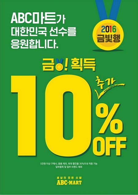 또한 ABC마트는 대회에서 한국 대표선수가 1위로 시상대에 오를 경우, 당일 하루 동안 전국 매장에서10% 추가 할인을 실시하는 이벤트도 실시한다. 할인 적용 대상은 5만원 이상 제품에 한하며, 기존 할인상품의 경우 중복 할인율은 최대 30%이내로 제한된다. 하루에 여러 선수가 1위에 오르더라도 할인율은 10%만 제공한다. 온라인몰에서는 시상여부와 관계 없이 대회가 폐막하는 22일까지 10%추가 할인을 제공한다.
