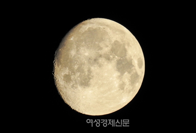 한가위 하루 앞둔 14일 밤의 달 모습. 내일이면 꽉 찬 달이 되어야하는데 현재 모습으로 보아서는 채워지기 어려워 보인다. 올해 음력 8월은 태양과 지구와 달의 공전 거리가 예년과 달라 추석 이틀후인 17일에야 둥근 보름달을 볼 수 있다고 한다. (14일 밤 9시 30분 촬영)