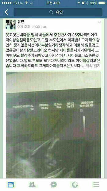 게시물에는 "내 아들을 지키기 위해서 그 어떤 짓도 할 감수가 되어 있다. 말도, 부모도, 모두 다 저버리더라도 아이를 살리고 싶습니다. 후회하더라도 그게 아이를 지우는 것보다…"라는 내용이 담겨 있었다.