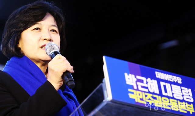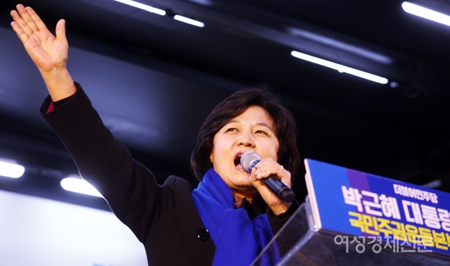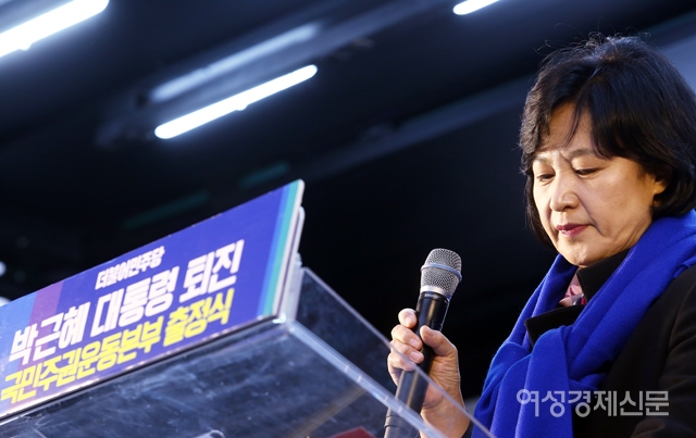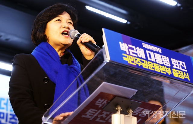 ▲ 더불어민주당 추미애 대표가 18일 서울 종로구 세종문화회관 계단에서 열린 ‘박근혜 대통령 퇴진 국민주권운동본부’ 출정식에서 연설하고 있다. /양문숙 기자 photoyms@seoulmedia.co.kr