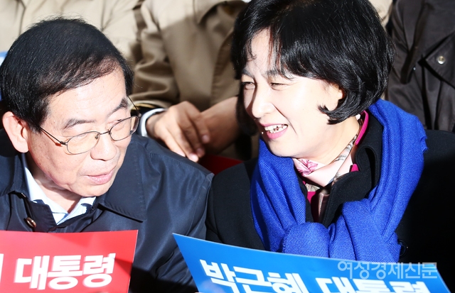 ▲ 더불어민주당 추미애 대표(오른쪽)가 18일 서울 종로구 세종문화회관 계단에서 열린 ‘박근혜 대통령 퇴진 국민주권운동본부’ 출정식에서 박원순 서울시장과 대화를 나누고 있다. /양문숙 기자 photoyms@seoulmedia.co.kr