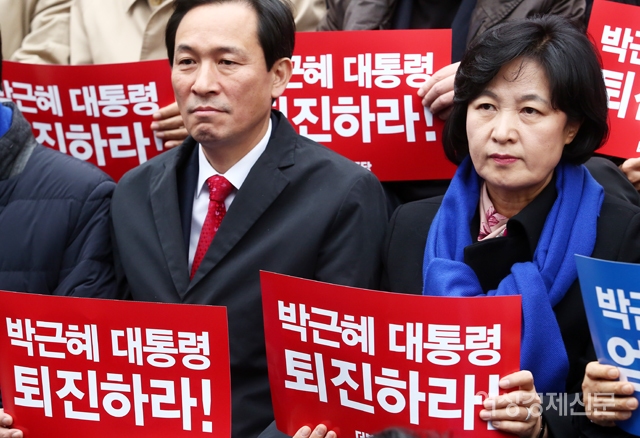 ▲ 더불어민주당 추미애 대표(오른쪽)와 우상호 원내대표가 18일 서울 종로구 세종문화회관 계단에서 열린 ‘박근혜 대통령 퇴진 국민주권운동본부’ 최순실 국정농단 사건을 규탄하며 박 대통령의 하야를 촉구하고 있다. /양문숙 기자 photoyms@seoulmedia.co.kr
