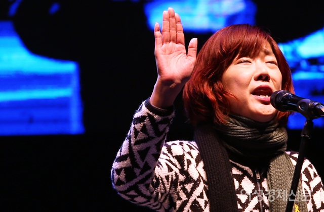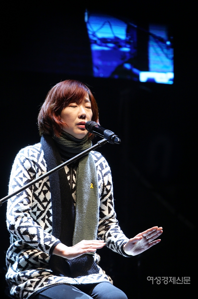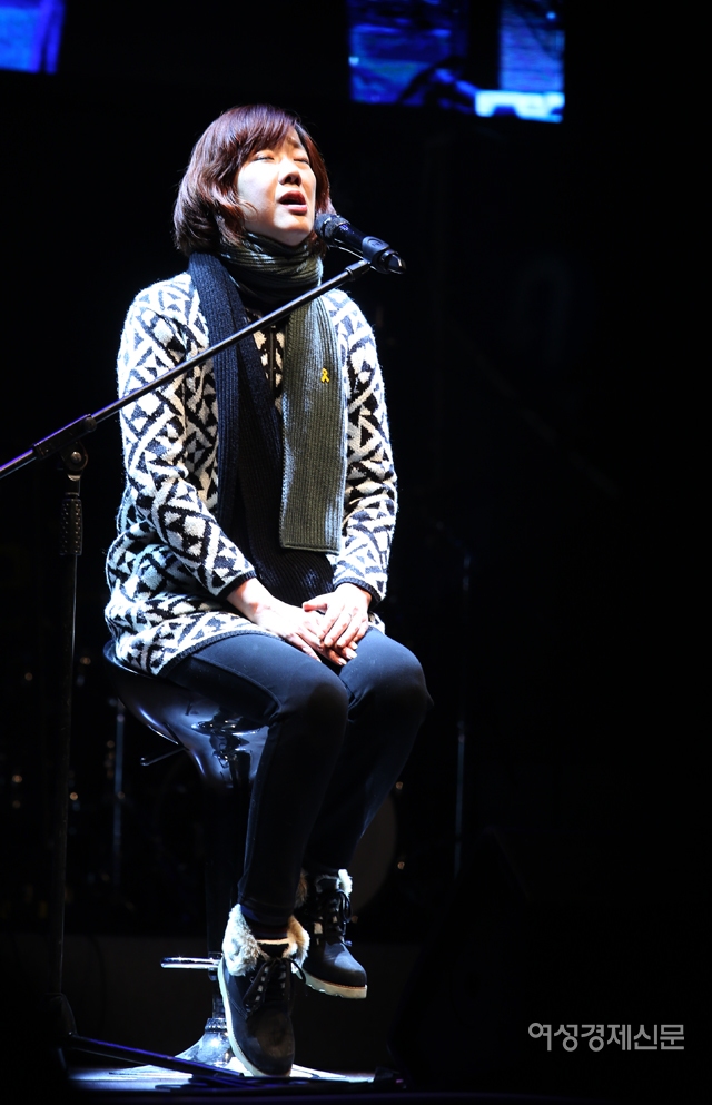 ▲ 가수 이상은이 7일 서울 광화문광장에서 열린 11차 촛불집회 무대에 올라 "제 노래가 촛불처럼 사람들 마음에 위로와 힘이 되고 소망을 향해 가는 에너지가 됐으면 좋겠다"며 '어기야디어라' '새' 등을 열창하고 있다. /양문숙 기자 photoyms@seoulmedia.co.kr