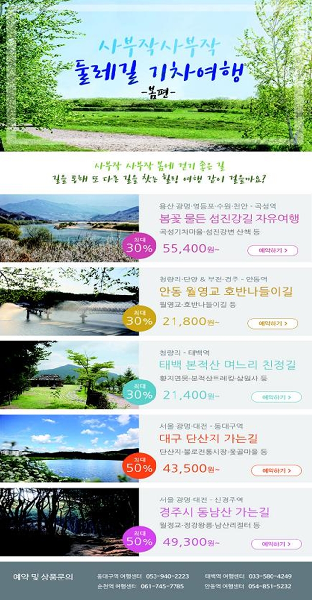봄에 걷기 좋은 길은 △섬진강 따라 걷는 길(곡성역) △월영교 호반나들이길(안동역) △본적산 며느리 친정길(태백역) △단산지 둘레길(동대구역) △동남산 둘레길(신경주역)이다.