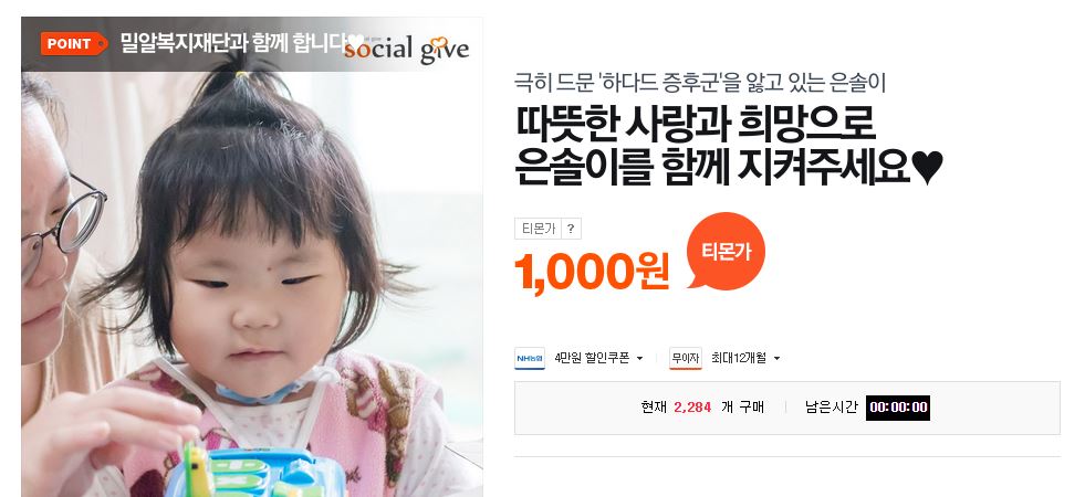 가장 많은 모금이 모인 기부는 티몬이 창립 4주년을 기념하며, 5월 한달 동안 진행한 '눈 없이 태어난 아기 동건이' 돕기로, 총 8955명의 고객들이 동참해 무려 4822만원이 모금됐다.