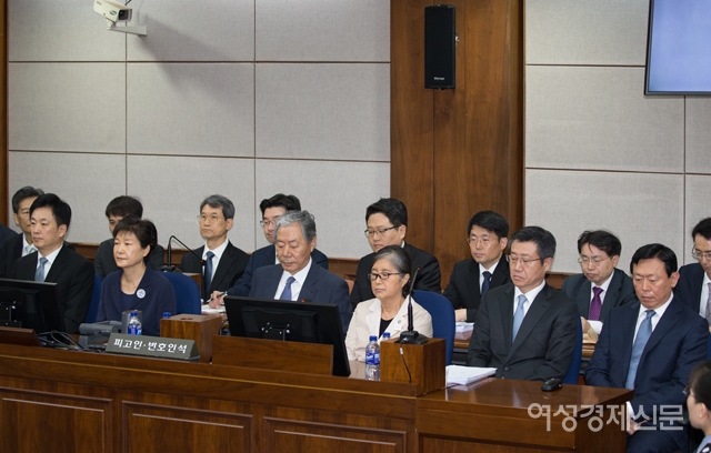 ▲ 박근혜 전 대통령과 최순실씨가 23일 오전 서초구 서울중앙지방법원에서 열린 박 전 대통령의 592억 원대 뇌물 수수 혐의 등에 대한 첫 정식재판에 참석해 앉아 있다. /사진공동취재단▲ 박근혜 전 대통령과 최순실씨가 23일 오전 서초구 서울중앙지방법원에서 열린 박 전 대통령의 592억 원대 뇌물 수수 혐의 등에 대한 첫 정식재판에 참석해 앉아 있다. /사진공동취재단
