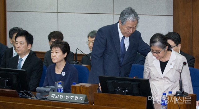 ▲ 박근혜(앞줄 왼쪽 두번째) 전 대통령과 국정농단 사태의 주범 비선실세 최순실(앞줄 왼쪽 네번째)이 23일 오전 서초구 서울중앙지방법원에서 박 전 대통령의 592억 원대 뇌물 수수 혐의 등에 대한 첫 정식재판에 참석해 자리하고 있다. /사진공동취재단