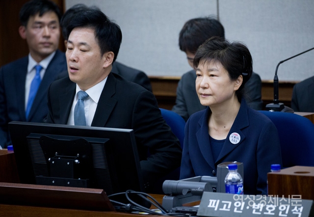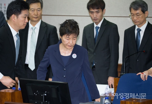 ▲ 박근혜 전 대통령이 23일 오전 서초구 서울중앙지방법원에서 592억 원대 뇌물 수수 혐의 등에 대한 첫 정식재판에 참석하고 있다. /사진공동취재단▲ 박근혜 전 대통령이 23일 오전 서초구 서울중앙지방법원에서 592억 원대 뇌물 수수 혐의 등에 대한 첫 정식재판에 참석하고 있다. /사진공동취재단