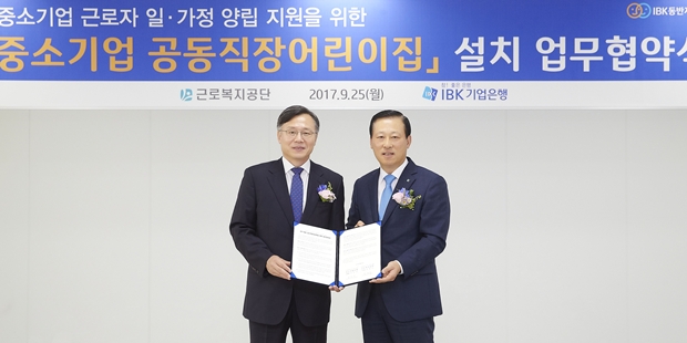 IBK기업은행은 근로복지공단과 산업 단지 및 중소기업 밀집지역에 직장어린이집 설치를 추진하는 ‘중소기업 공동직장어린이집 설치 협약’을 체결했다고 25일 밝혔다.