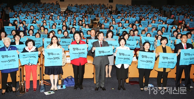 "정의로운 사회 실현은 여성참여 50%! 민주주의의 완성은 여성참여 50%!"