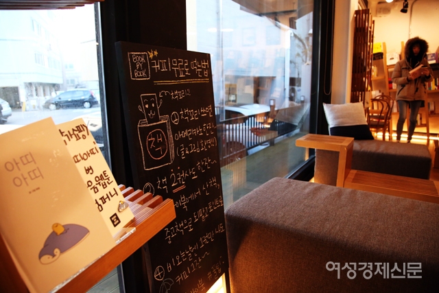 “책 두 권을 사면 커피 한 잔을 무료로 마실 수 있어요. 책을 살 때마다 5%씩, 다 읽은 책을 되팔면 책값의 80%가 적립된 포인트로 다양한 음료나 맥주를 마실 수도 있어요. 굳이 할인받을 수 있는 온라인 서점을 찾지 않고 우리 책방을 찾는 고객에게 혜택을 주기 위해 생각해낸 아이디어에요.”