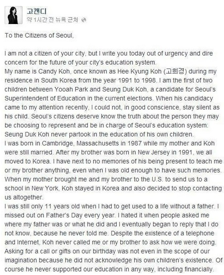 고승덕 후보의 장녀라고 밝힌 고희경씨(캔디 고)는 31일 페이스북에 영문으로 쓴 장문을 올렸다.