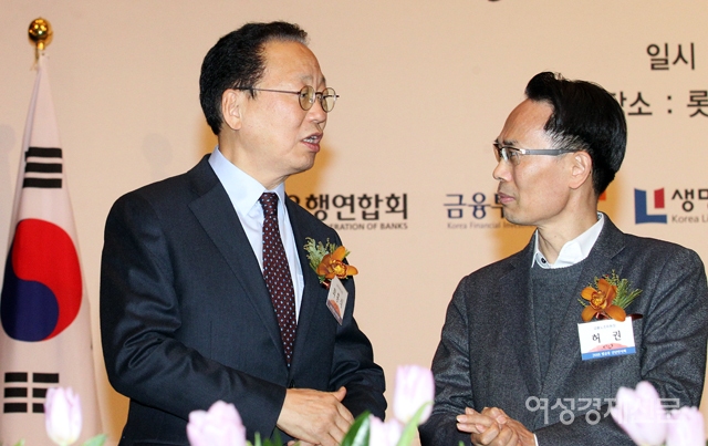 최흥식 금융감독원장(왼쪽)과 허권 금융노조위원장이 3일 서울 소공동 롯데호텔에서 열린 2018년 범금융 신년인사회에 참석해 이야기를 나누고 있다. /양문숙 기자 photoyms@seoulmedia.co.kr