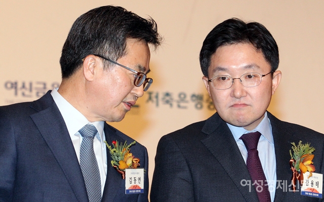 김동연 경제부총리 겸 기획재정부 장관과 김용태 국회 정무위원장(오른쪽)이 3일 서울 중구 롯데호텔에서 열린 2018면 범금융 신년인사회에 참석해 대화를 나누고 있다. /양문숙 기자 photoyms@seoulmedia.co.kr