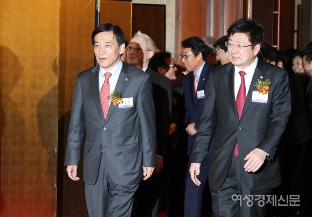 이주열 한국은행 총재(왼쪽)와 자유한국당 이종구 의원이 3일 서울 중구 롯데호텔에서 열린 2018면 범금융 신년인사회에 참석하고 있다. /양문숙 기자 photoyms@seoulmedia.co.kr