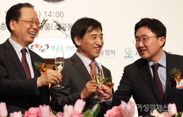 최흥식 금융감독원장, 이주열 한국은행 총재, 김용태 국회 정무위원장(왼쪽부터)이 3일 오후 소공동 롯데호텔에서 열린 2018년 범금융 신년인사회에서 건배를 하고 있다. /양문숙 기자 photoyms@seoulmedia.co.kr