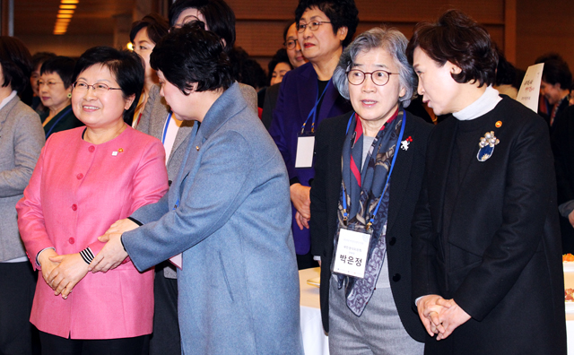 정현백 여성가족부 장관, 정춘숙 더불어민주당 의원, 박은정 국민권익위원회 위원장, 김현미 국토교통부 장관(왼쪽부터) 등이 5일 서울 중구 대한상공회의소 국제회의장에서 '나라다운 나라, 여성이 만듭니다'를 주제로 열린 여성신년인사회에 참석하고 있다. /양문숙 기자 photoyms@seoulmedia.co.kr