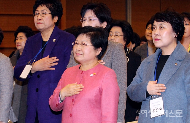 정현백 여성가족부 장관(가운데), 정춘숙 더불어민주당 의원(오른쪽) 등이 5일 서울 중구 대한상공회의소 국제회의장에서 '나라다운 나라, 여성이 만듭니다'를 주제로 열린 여성신년인사회에 참석해 국민의례를 하고 있다. /양문숙 기자 photoyms@seoulmedia.co.kr