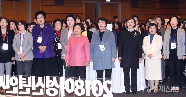 정현백 여성가족부 장관, 김현미 국토교통부 장관 등이 5일 서울 중구 대한상공회의소 국제회의장에서 '나라다운 나라, 여성이 만듭니다'를 주제로 열린 여성신년인사회에 참석해 애국가 제창을 하고 있다. /양문숙 기자 photoyms@seoulmedia.co.kr