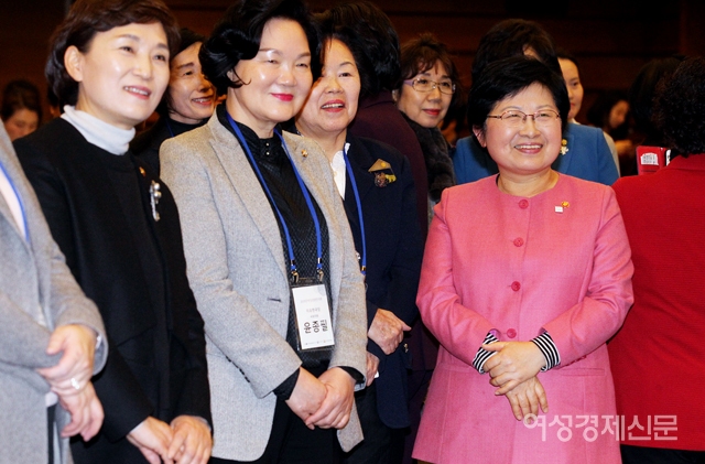 정현백 여성가족부 장관, 윤종필 자유한국당 의원, 김현미 국토교통부 장관(오른쪽부터) 등이 5일 서울 중구 대한상공회의소 국제회의장에서 '나라다운 나라, 여성이 만듭니다'를 주제로 열린 여성신년인사회에 참석하고 있다. /양문숙 기자 photoyms@seoulmedia.co.kr