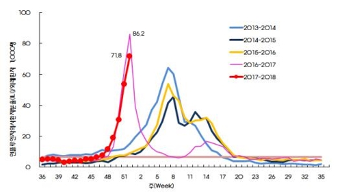 가장 최근 집계인 52주차(12월 24~30일) 인플루엔자 의사환자 수는 외래환자 1천명당 71.8명에 달했다.