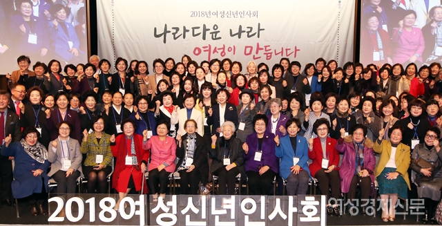 정현백 여성가족부 장관(앞줄 왼쪽 다섯번째), 남인순 국회 여성가족위원장(앞줄 오른쪽 여섯번째)  등이 5일 서울 중구 대한상공회의소 국제회의장에서  '나라다운 나라, 여성이 만듭니다'를 주제로 열린 여성 신년인사회에서 기념촬영을 하고 있다. /양문숙 기자 photoyms@seoulmedia.co.kr