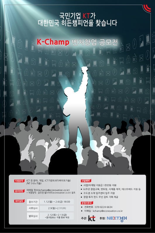 KT는 정보통신기술(ICT) 기반의 한국형 히든챔피언을 발굴하기 위한 'K-Champ(케이-챔프) 벤처 창업 공모전'을 12일부터 다음달 6일까지 진행한다.