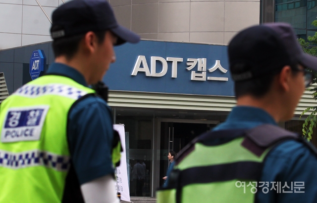 보안 전문기업 ADT캡스를 SK텔레콤과 맥쿼리인프라리얼에셋에 2조 9700억원에 매각하기로 합의한 가운데 8일 서울 강남구 봉은사로 ADT캡스 본사 앞으로 경찰들이 지나가고 있다. 이날 서비스연맹 ADT캡스노조가 '회사매각 관련 6대 요구사항 쟁취 집회'를 열었다. /양문숙 기자 yms7890@hanmail.net
