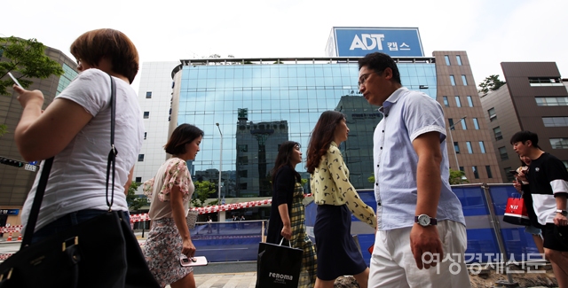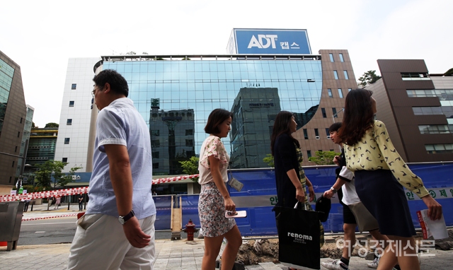 보안 전문기업 ADT캡스를 SK텔레콤과 맥쿼리인프라리얼에셋에 2조 9700억원에 매각하기로 합의한 가운데 8일 서울 강남구 봉은사로 ADT캡스 본사 앞으로 시민들이 지나가고 있다. 이날 서비스연맹 ADT캡스노조가 '회사매각 관련 6대 요구사항 쟁취 집회'를 열었다. /양문숙 기자 yms7890@hanmail.net