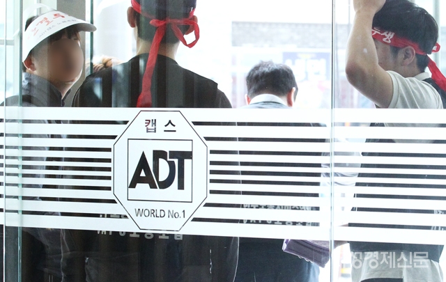 보안 전문기업 ADT캡스를 SK텔레콤과 맥쿼리인프라리얼에셋에 2조 9700억원에 매각하기로 합의한 가운데 8일 서울 강남구 봉은사로 ADT캡스 본사에 서비스연맹 ADT캡스노조가 '회사매각 관련 6대 요구사항 쟁취 집회'를 열리고 있다. /양문숙 기자 yms7890@hanmail.net