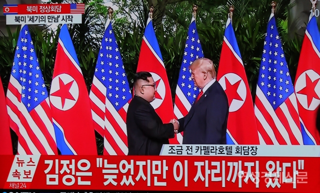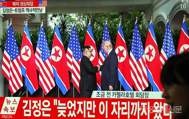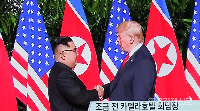 북미 정상회담이 시작된 12일 오전 서울 용산구 서울역에 설치된 TV에 김정은 북한 국무위원장과 도널드 트럼프 미국 대통령의 첫 만남이 생중계되고 있다. /양문숙 기자 yms7890@hanmail.net북미 정상회담이 시작된 12일 오전 서울 용산구 서울역에 설치된 TV에 김정은 북한 국무위원장과 도널드 트럼프 미국 대통령의 첫 만남이 생중계되고 있다. /양문숙 기자 yms7890@hanmail.net북미 정상회담이 시작된 12일 오전 서울 용산구 서울역에 설치된 TV에 김정은 북한 국무위원장과 도널드 트럼프 미국 대통령의 첫 만남이 생중계되고 있다. /양문숙 기자 yms7890@hanmail.net