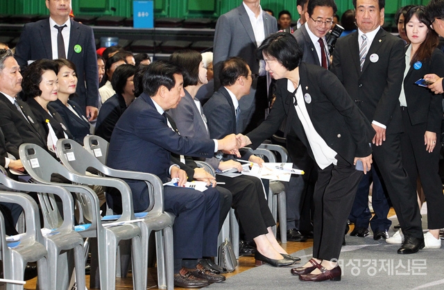 김성태 자유한국당 대표 권한대행과 추미애 더불어민주당 대표가 25일 오전 서울 송파구 잠실실내체육관에서 열린 제68주년 6·25전쟁 기념식에 참석해 인사를 나누고 있다./양문숙 기자 yms7890@hanmail.net