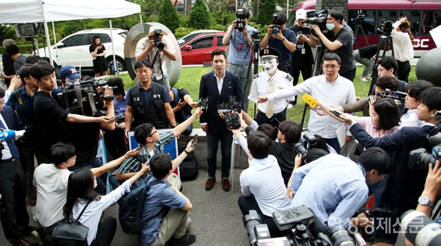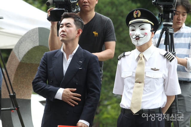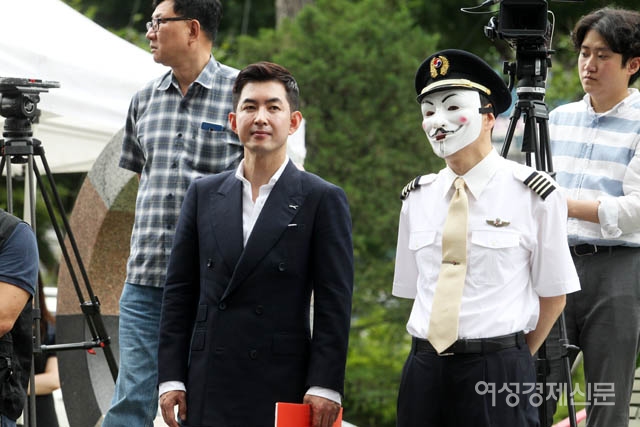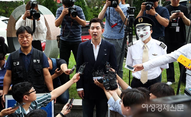 조양호 한진그룹 회장의 검찰 소환조사가 예고된 28일 서울 양천구 서울남부지방검찰청에서 박창진 전 대한항공 사무장과 직원연대 공동대표가 "조 회장이 책임질 일이 있으면 책임져야 한다"며 갑질 행태를 규탄하는 발언을 하고 있다. /양문숙 기자 yms7890@hanmail.net